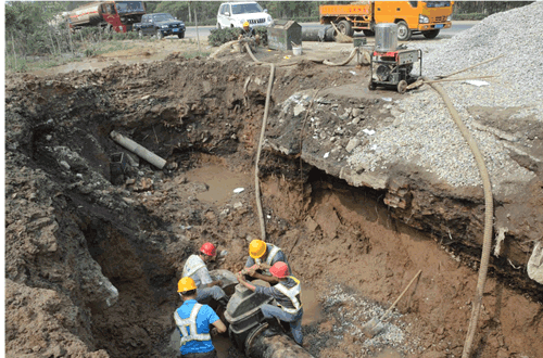 據(jù)現(xiàn)場(chǎng)工作人員介紹,爆管處位于107國(guó)道東側(cè)廢棄的排水溝附近,地下不斷涌出的自來(lái)水造成搶修地點(diǎn)附近多次發(fā)生塌陷,給搶修工作帶來(lái)了不利。為盡快修復(fù)受損管線,確保搶修期間人員及過(guò)往人員車輛的安全,自來(lái)水公司搶修人員擴(kuò)大了現(xiàn)場(chǎng)圍擋的面積,開(kāi)挖出近20平米的長(zhǎng)方形型作業(yè)面,并將長(zhǎng)5米的受損水泥管道整體更換為鋼管。 搶修工地負(fù)責(zé)人楊華告訴記者,該處輸水管線直徑400毫米,是連接市區(qū)到黃粱夢(mèng)鎮(zhèn)的唯一輸水管線。這條管線的爆裂直接影響該鎮(zhèn)居民的用水,“我們安排搶修工人分班作業(yè),不間斷連夜搶修,確保輸水管線盡快修復(fù)。”
