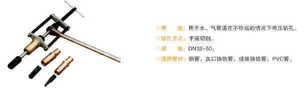 手動不停水打孔機在建設(shè)、鋪設(shè)管道中,分支管道嫁接管道成為必不可少的工作,而對于各類材質(zhì)的管道進行開孔則是首要問題,聊城市鴻福管業(yè)有限公司生產(chǎn)的手動不停水打孔機可以適用于國標球鐵管、球墨管、水泥管、塑料管等材質(zhì)的管道,為管道建設(shè)作出了應(yīng)有的貢獻。手動不停水打孔機開孔器主要是用于供水、煤氣、石油、化工等各種規(guī)格主管道的嫁接分支管道作業(yè)。